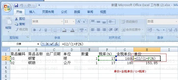 单价=含税单价/(1+税率),如图 fx==G2/(1+F2%),在excel表格中就算出单价