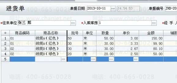 3、进货时使用批号标识不同规格商品,以批号表示不同长度规格的商品,比如进货,线缆A(红色),50米的1卷,30米的1卷;线缆B(绿色),30米的1卷,20米的1卷;如下图,其中商品线缆A(红色),批号50,录入数量50,单价3,表示一卷50米的线缆A(红色);