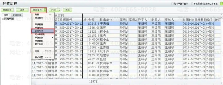 1.点击【信息中心】-【经营历程】找到该张销售出库单之后,点击【高级操作】-【红字反冲】:
