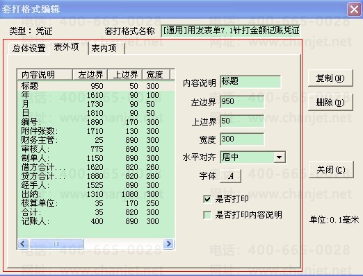 点击“复制”从系统模板中复制一份过来,输入套打格式名称,在总体设置中设置页的属性,如上图。