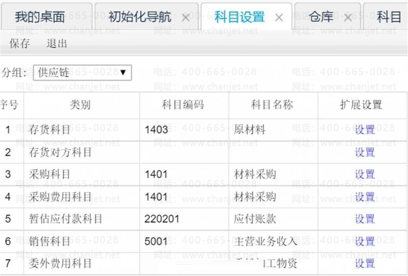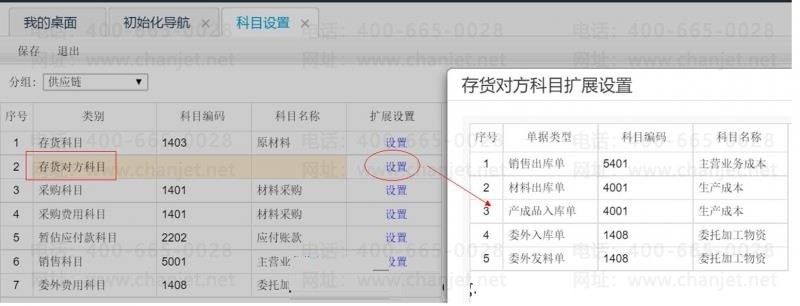 【存货对方科目】一般需要按照不同的单据类型设置不同的入账科目,所以需要点开【设置】、进入到扩展设置中进行定义。