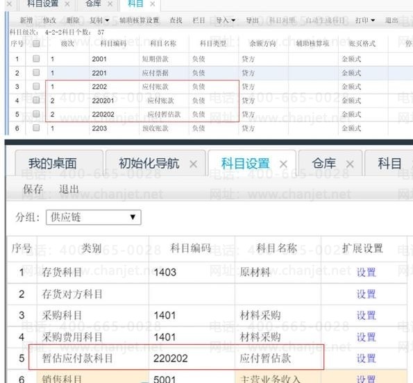 软件中涉及到采购暂估的入库单,都会走暂估的中间过渡科目。如果想要将应付账款和暂估应付款区分,那么建议在【应付账款】科目下增加二级明细科目,【应付账款】和【应付暂估款】。