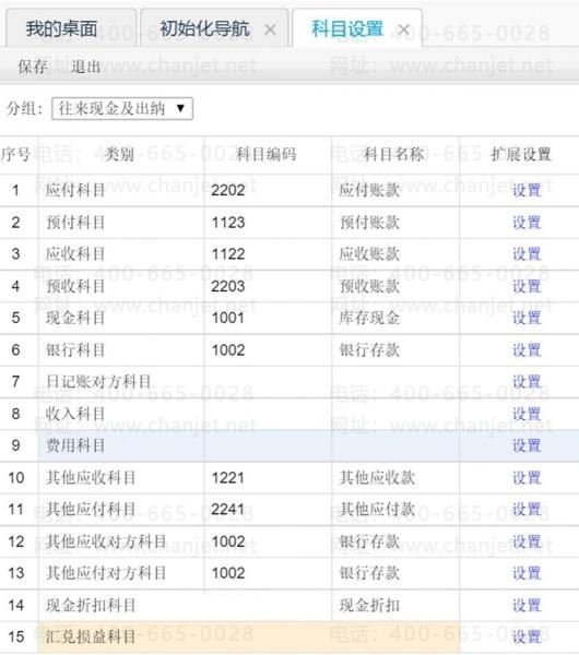 3.分组选择【往来现金及出纳】,科目设置请参照下图。
