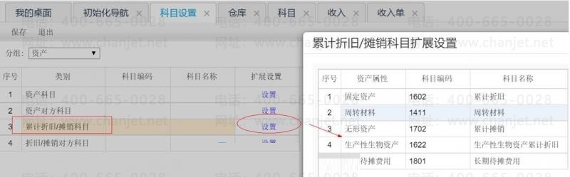 如果只是固定资产,可直接在【科目设置】中定义入账科目【累计折旧】。如果存在无形资产等,请参照下图进行定义。