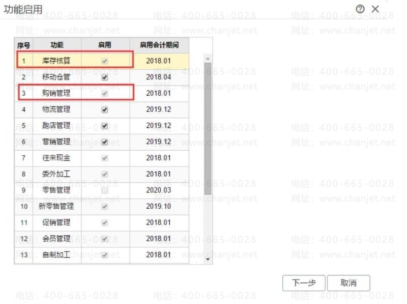 经分析,是由于启用了"U 会员"导致"库存何算“和”购销“模块不能反启用,请在系统管理 ->选项设置中,会员页签中找到”启用 U 会员“,把这一项的勾去掉,就可以对这库存核算 和购销管理两个模块反启用了。