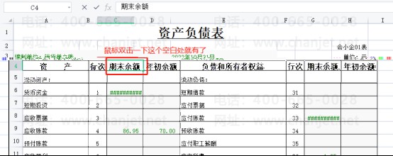 原因:资产负债表‘期末余额’这个标题在软件里的单元格格式为【数值】类型,所以汉字就不显示了。