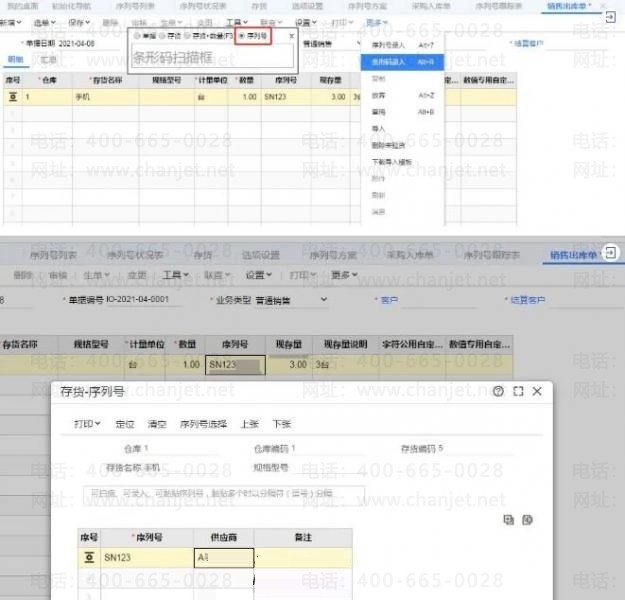 第六步:销售出库,扫描序列号,自动带出仓库,存货,序列号信息,实现快速销售,序列号录入中可以显示采购供应商;