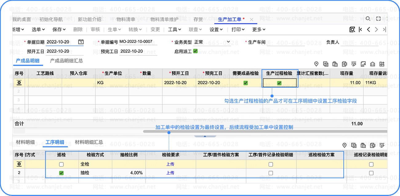 在生产加工单中,勾选生产过程检验的产品才可在工序明细中设置工序检验字段。