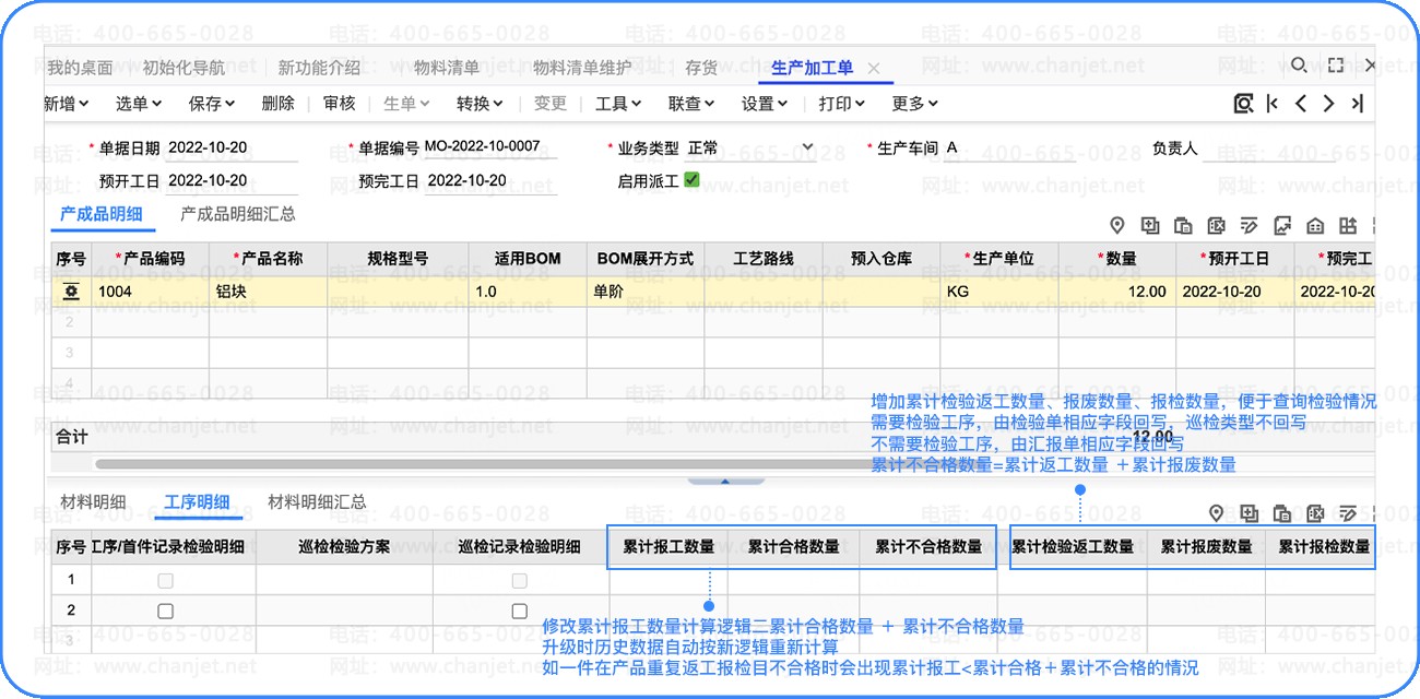 新增累计检验返工数量、报废数量、报检数量,便于查询检验情况需要检验工序,由检验单相应字段回写,巡检类不能回写,不需要检验工序,由汇报单位相应字段回写,累计不合格数量=累计返工数量+累计报废数量。