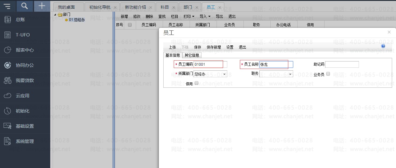 3.设置人员档案:点基础设置——>常用信息设置——>员工。对于某些科目要设置了个人辅助核算等情况,需要增加相应的人员档案。若想统计一些人员的出生日、学历、电话,可以“其它信息”中录入。