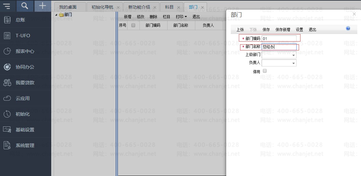2、设置部门档案:点基础设置——>常用信息设置——>部门。对于某些科目要设置了部门辅助核算等情况,需要增加相应的部门档案。