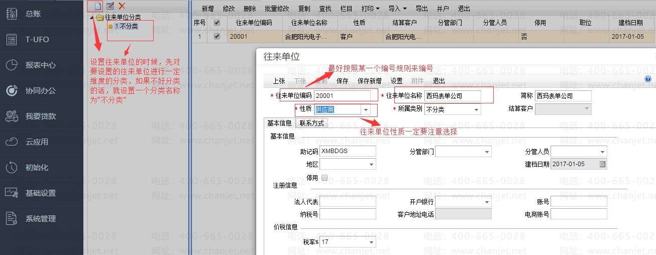 4.设置往来单位:点基础设置——>常用信息设置——>往来单位。对于某些科目(如应收票据、应收账款、预收账款、应付票据、应付账款、预付账款等)要设置了往来单位核算等情况,需要增加相应的往来单位档案。