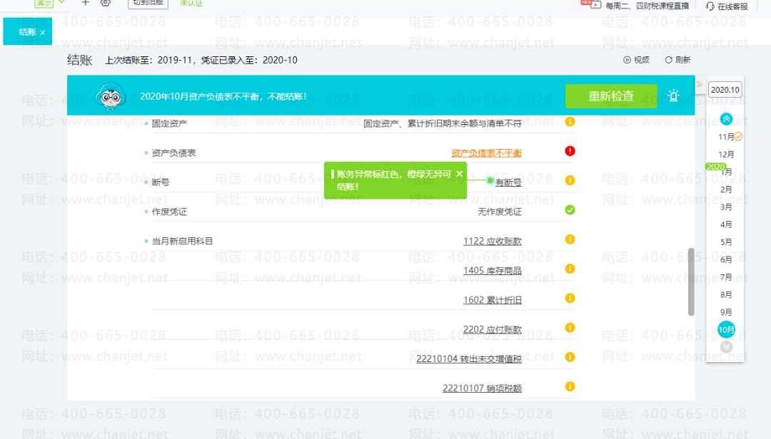 当结账内容出现异常,点异常提示快速调整,如:资产负债表不平衡,直接点不平衡项进入资产负债表,可查看造成不平衡的具体项,并快速修改。