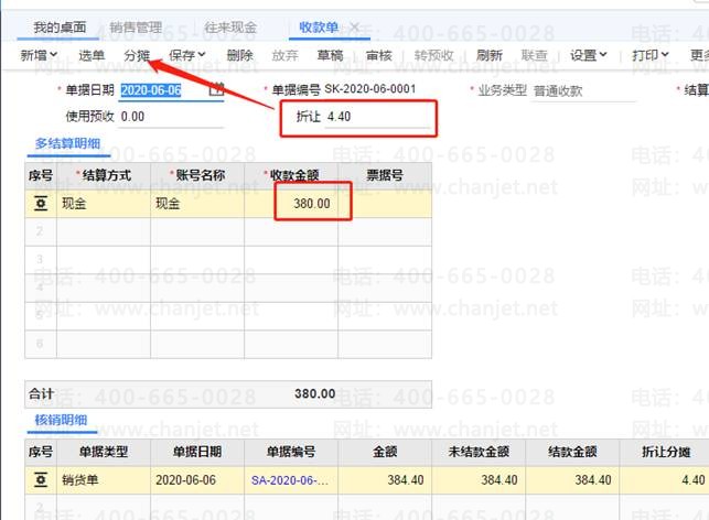 收款金额处录入整数380,折让录入4.4,再点击分摊,如下图: