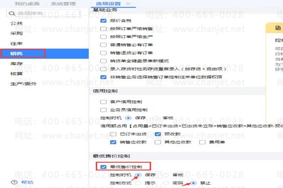 2、进入选项设置后,点击销售,把最低售价控制打上勾,控制时机可选择保存或者审核时来控制,控制方式为禁止,如下图: