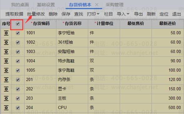 5、存货提取完成后,最后来设置最低售价,最低售价为最新进价的基础上加三个点,也就是“最新进价*1.03”,勾选所有存货,点击批量修改,选择好参数,点击执行,如下图: