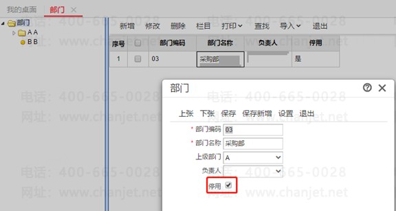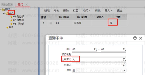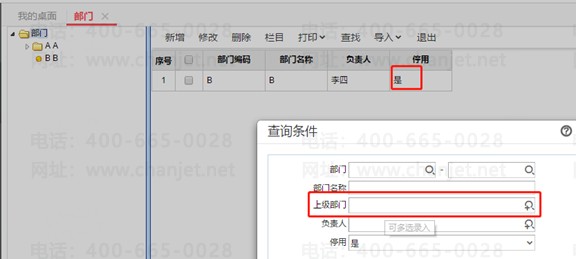 1.使用部门的查找条件查找停用部门时,如果部门有上级部门,则在查找里边输入【上级部门】,并且停用选择【是】,其他条件不用录入;