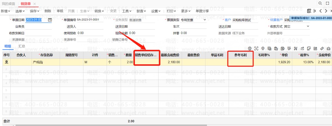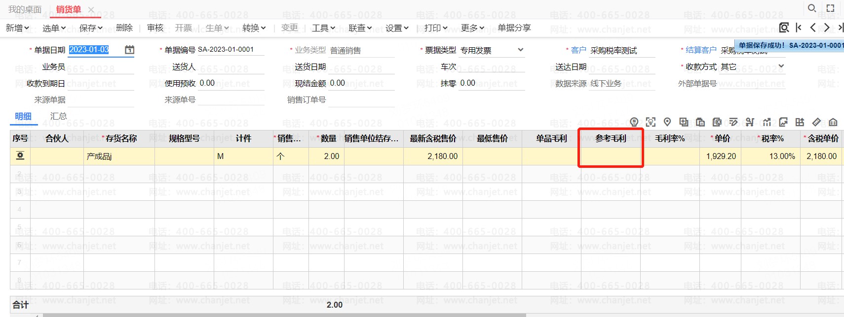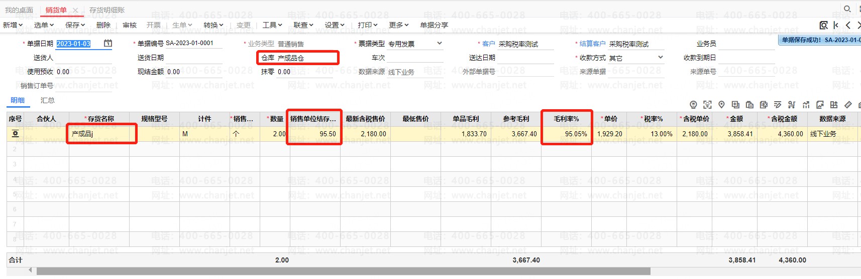 当销货单当单据录入好所有的数据后,即可得出毛利率的数据