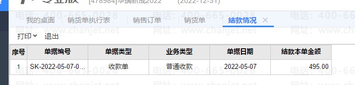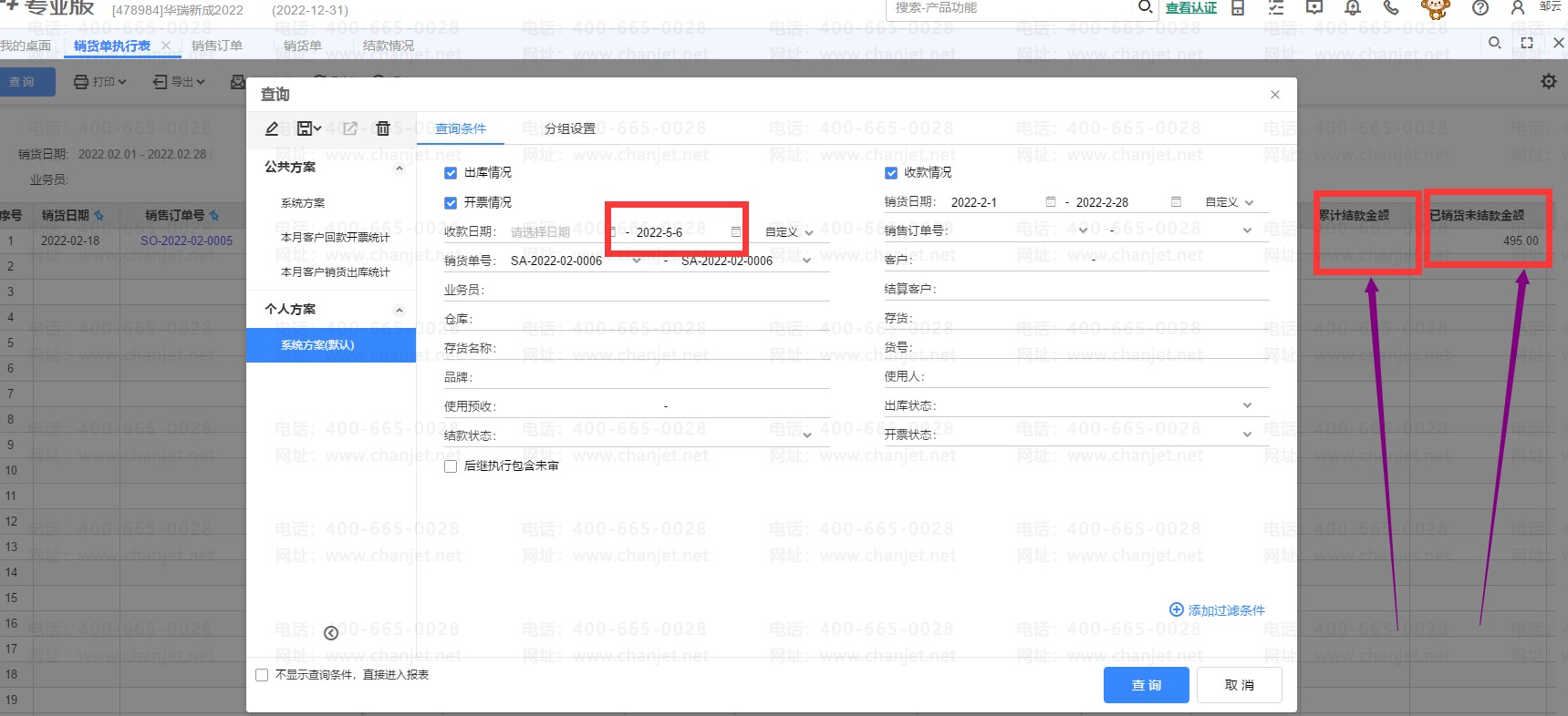 销货单执行表中查询条件里有收款日期,把查询日期设置为大于 2022.05.07发现有累计结款金额,已销货未结款金额为空。