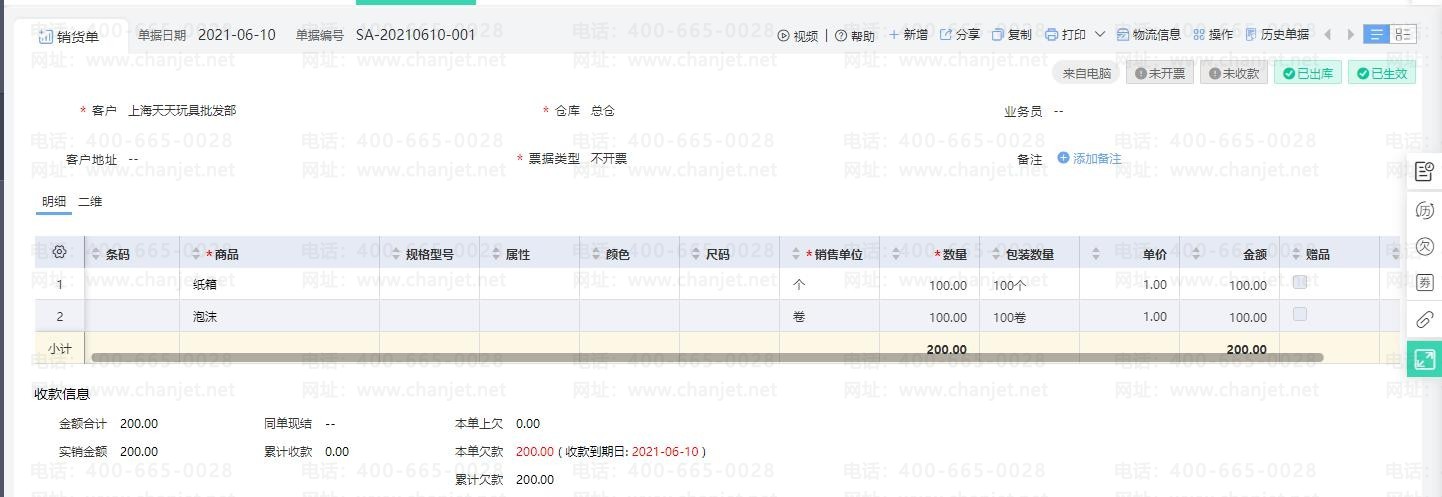 1.点击【销售管理】-【销货单】做一张 100 个纸箱和 100 卷泡沫的销货单: