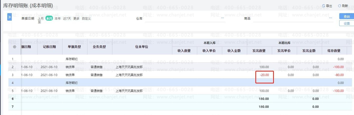 查看【库存成本明细账】,退货单形成了该存货的负数出库: