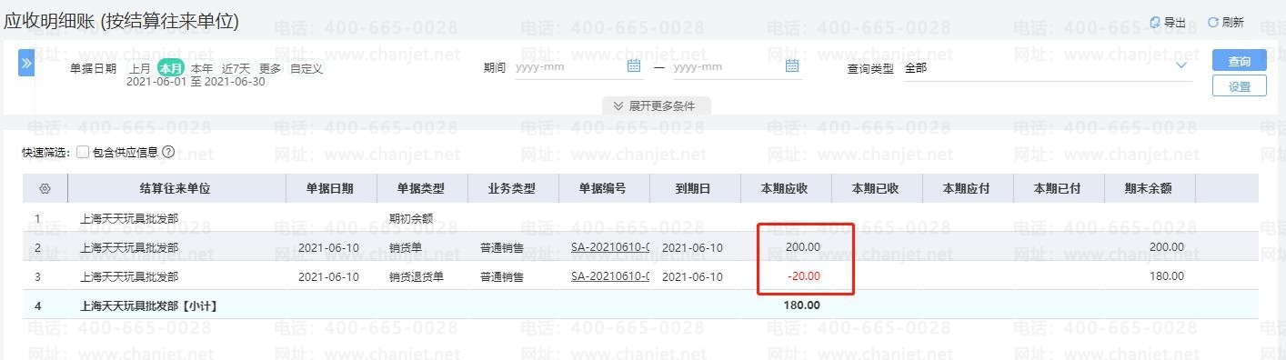 退货单审核出库之后,查看【应收明细账】,形成一笔该客户负数的应收:
