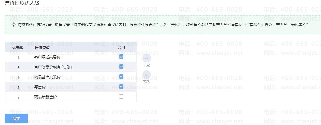 2. 【营销推广】-【售价提取设置】,在这里可以设置带入销售单据中的价格优先顺序,越往上优先级越高,当第一优先级价格取不到时再依次往下执行, 可设置的售价类型有【零售价】、【客户最近交易价】、【客户等级价或客户折扣】、【商品基准批发价】和【商品最新售价】5 种: