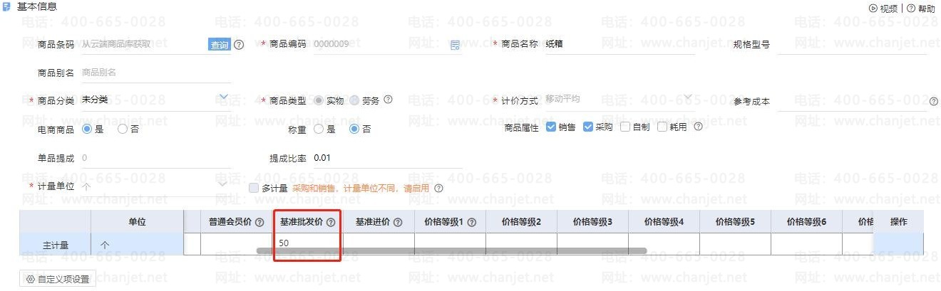 1. 当【售价提取设置】设置【商品基准批发价】为第一优先执行时,需要在【基础信息】-【商品】中设置商品的【基准批发价】: