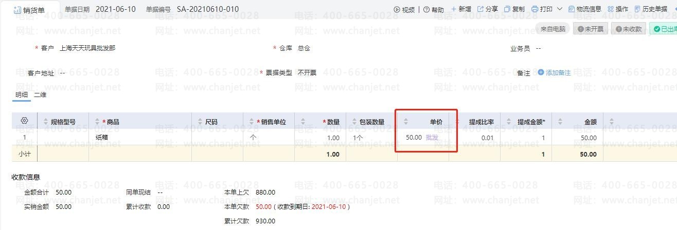 B、在销货单上会把零售价带到报价中,商品折扣带到折扣中,反算出单价: