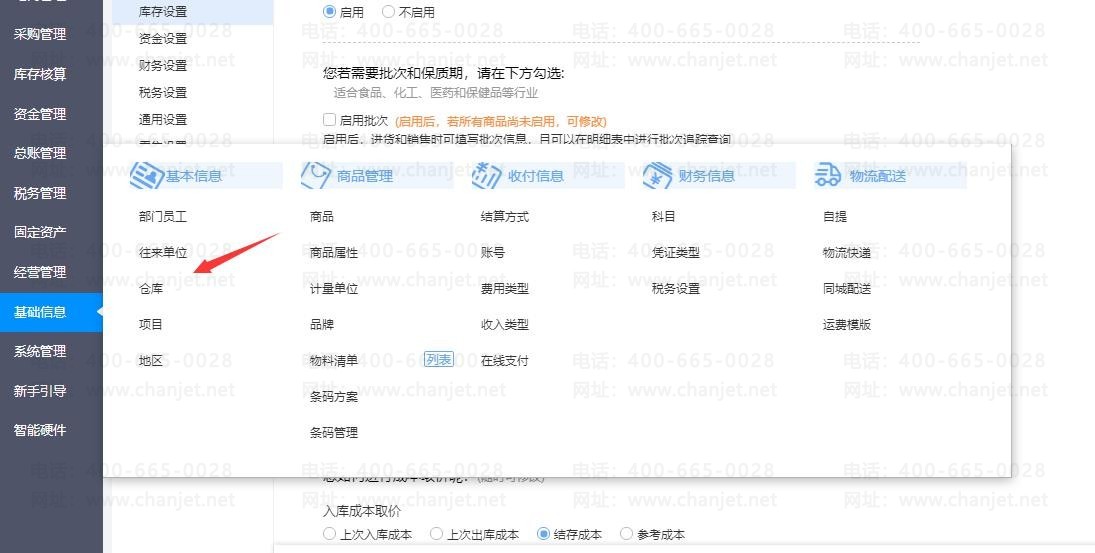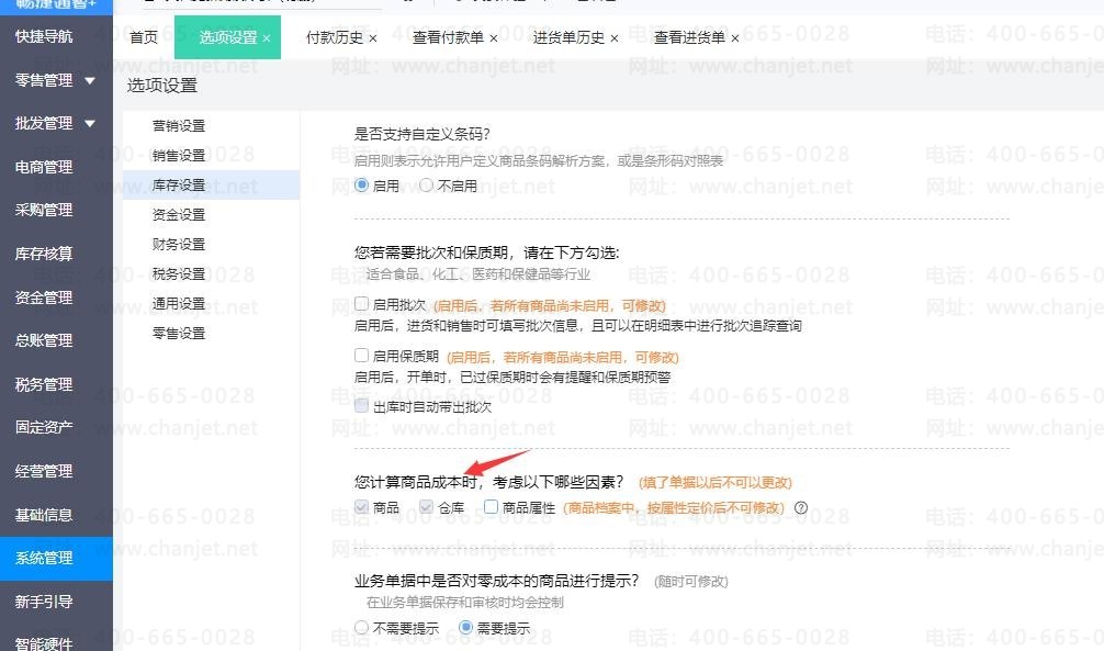 1、点击【系统管理】-【选项设置】-【库存设置】,在【您计算商品成本时, 考虑以下哪些因素?】勾选上【商品和仓库】,最后点击【保存】,然后刷新一下。