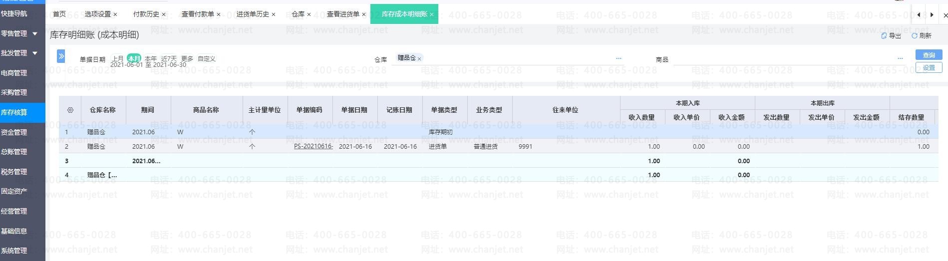 4、点击【库存核算】-【库存成本明细账】进去,选择仓库查询成本;可以看到, 赠品仓的结存成本为零。