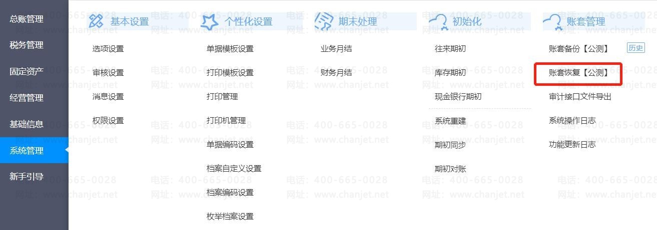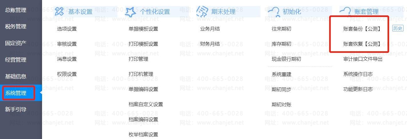 3、点击【系统管理】-【账套恢复【公测】】,点击【开始备份】(建议恢复时其他用户不要操作账套,否则会导致数据错误;因营销数据是统计一段连续时间的数据,所以账套恢复后,电脑和手机端的商品分析和客户分析数据统计有延迟,请在账套恢复第二天查询)