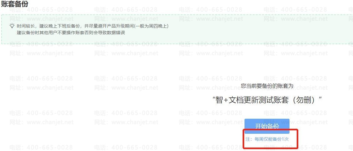 1、点击【系统管理】-【账套备份【公测】】,点击开始备份(每周仅能备份一次);再次备份的时候,系统会直接报错。