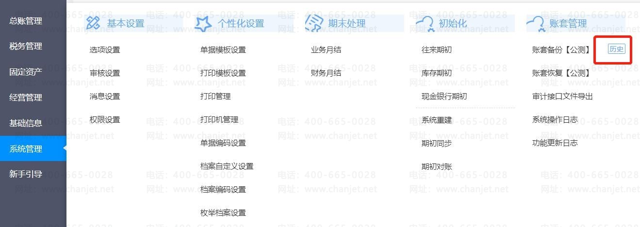 2、由于备份里面最多储蓄 3 个备份账套;所以可以点击到【账套备份历史】进去删除备份;删除之后可以在同一周再次备份