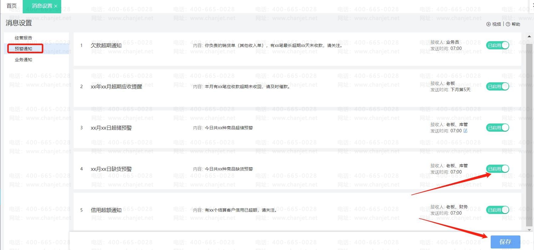 1、点击【系统管理】-【消息设置】-【预警通知】,缺货提醒打开并且保存。
