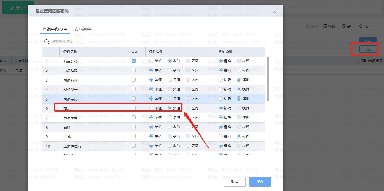 2、可以按照需要,点击右侧的【设置】勾选出来商品字段去筛选商品;
