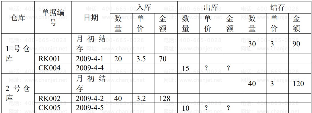1 号仓库:出库单价是(90+70)/ (30+20)=3.2;