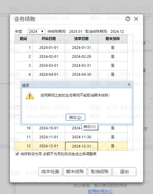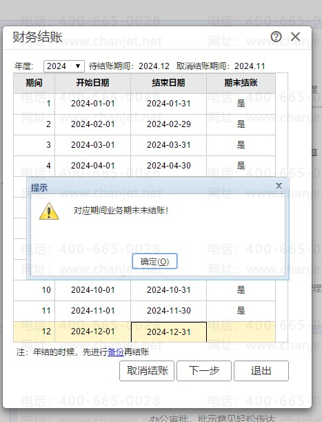 3.账套中有业务模块,需先将业务结账,再做财务结账,否则财务直接结账会提示对应期间业务期末未结账。