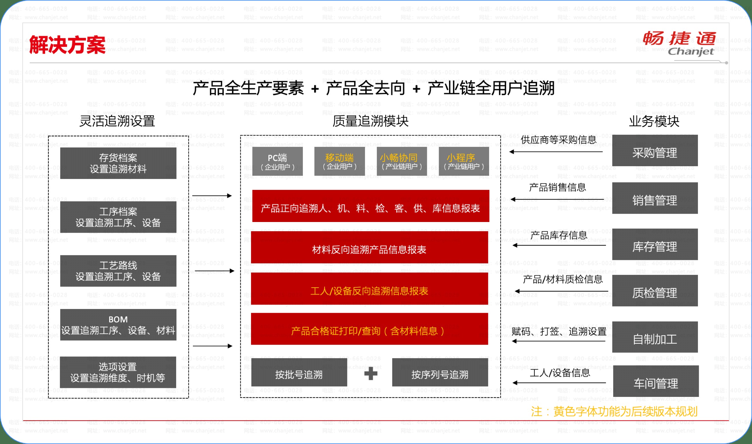 1、依托TC新制造全面的生产与质量数字化管理能力,帮助企业构建全链条、全要素的质量追溯体系,实现扫码一键追溯产品加工过程涉及的人、机、料、检信息以及材料供应商、销售客户、产品存放位置等信息,为产品质量问题分析、改进、产品召回等提供自动化的追溯工具,帮助企业提高质量问题分析效率、降低质量问题处理成本。