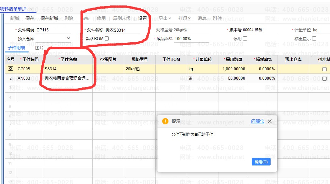 问题答复:看一下子件BOM里面是不是有父件作为材料,比如父件A子件B,这时候再去新建BOM父件B选子件A就会提示这个报错。