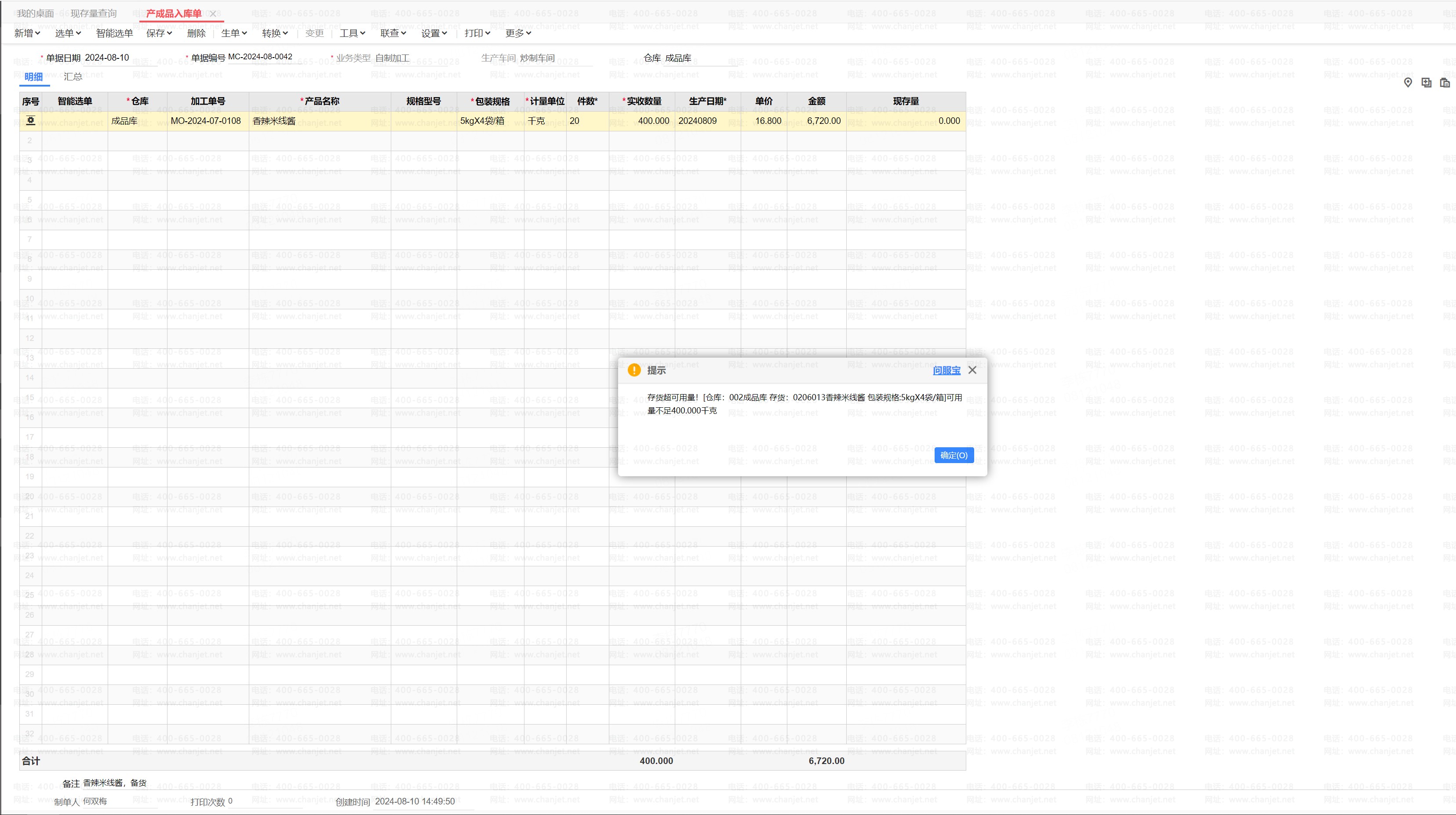 问题详情:产成品入库单报错!