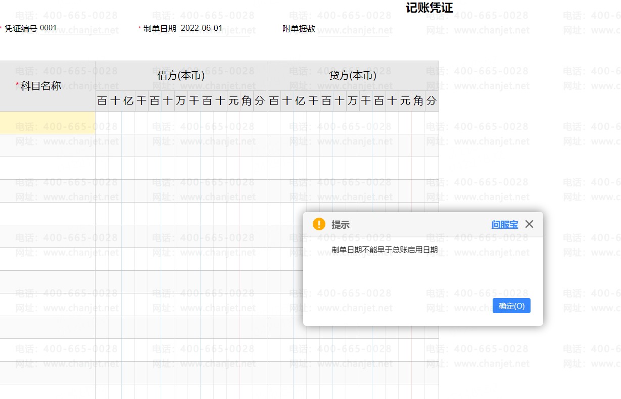 确认总账启用期间对应的日期是什么时候,点击【系统管理】-【会计期间】,找到总账启用期间,在会计期间对应年度的期间列表中查看该期间的开始日期,填凭证时不能早于该日期;有可能是这个2022.06的会计期间的开始日期不是6月1日。