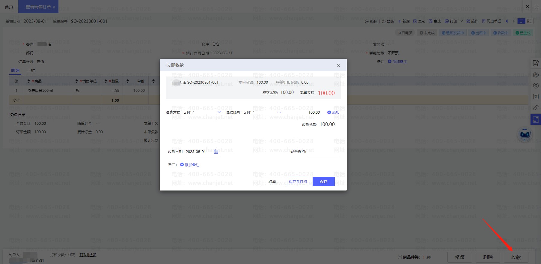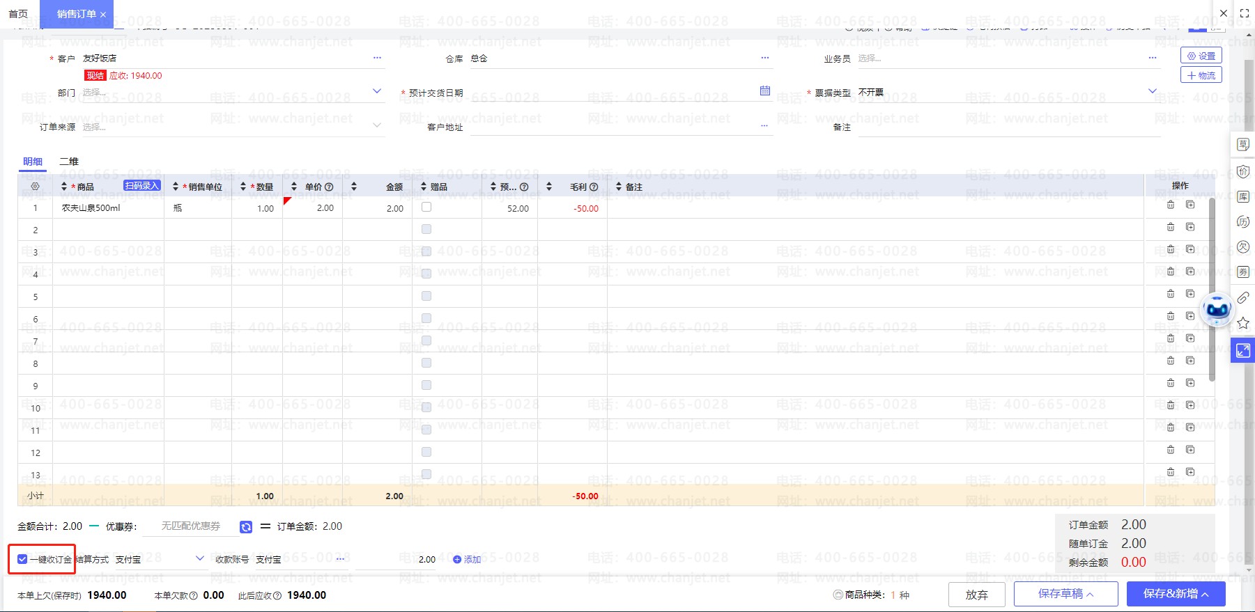 2、或者点击【销售管理】-【销售订单】-在销售订单未保存之前,点击【一键收订金】或者先点击【保存】单据,然后最后点击【收款】;