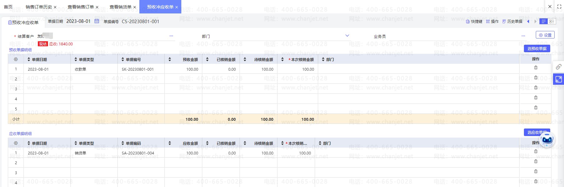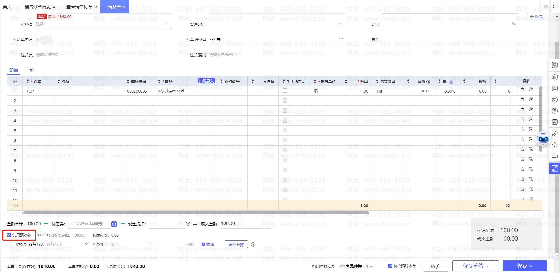 3、后面做销货单的时候,可以直接在销货单上面,保存之前,选择使用预收款。