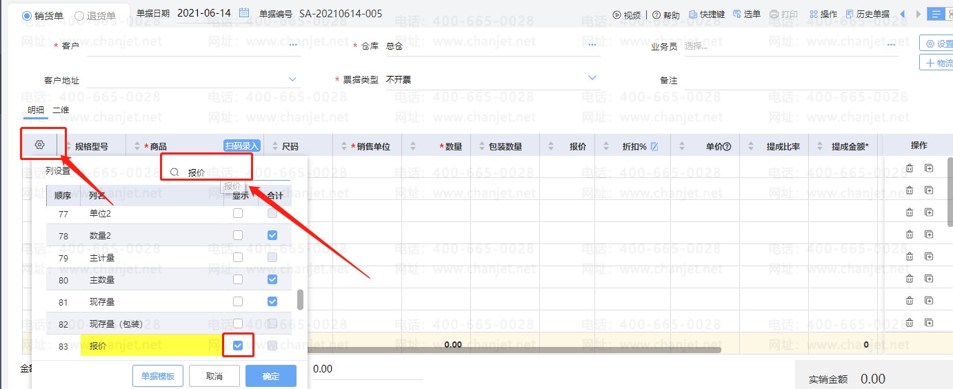 1.点击【销售管理】-【销货单】,在销货单表体前面小齿轮勾选出【报价】,【折扣%】和【折扣】字段显示: