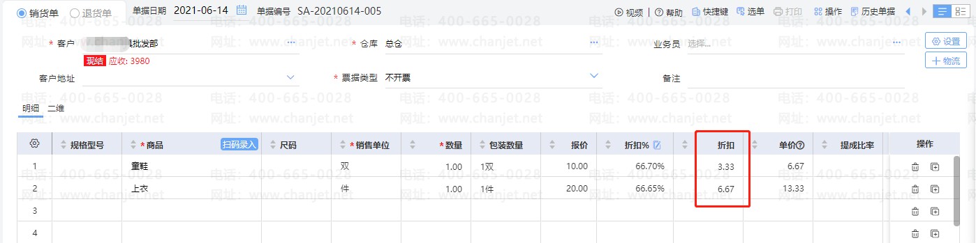 2.【整单折扣金额】中输入的金额会以金额为分摊方式分摊进表体折扣金额中: