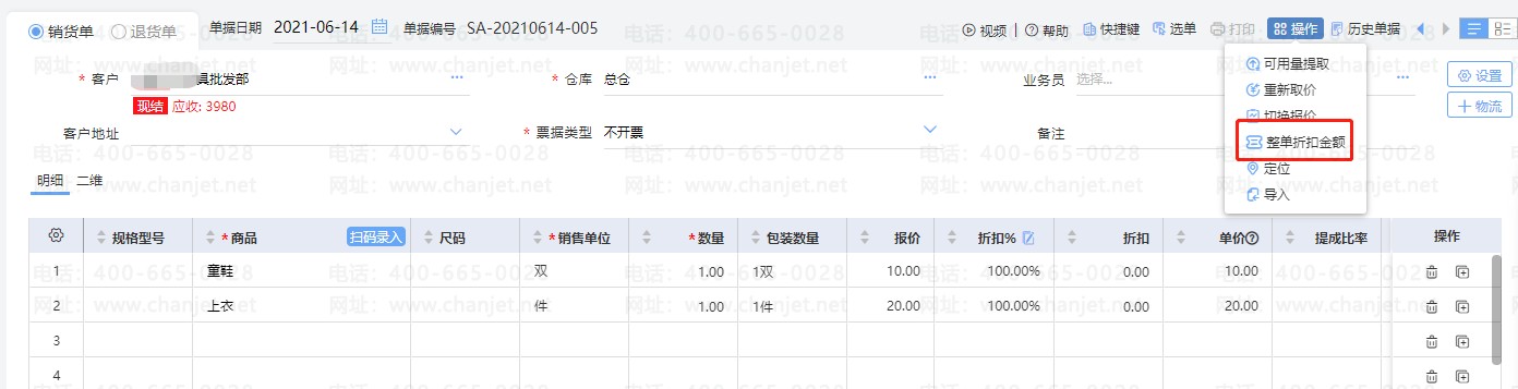 1.在销货单中,点击单据右上角的【操作】-【整单折扣金额】: