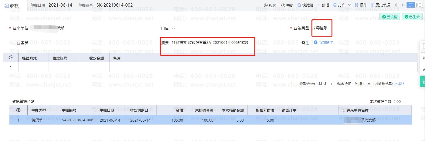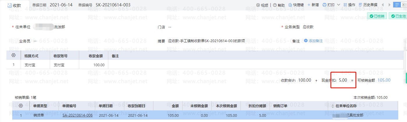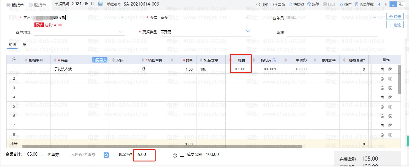 1.销售金额105元,因为最后只要收取100,想要在销货单中体现可以在单据下方的【现金折扣】中录入5: