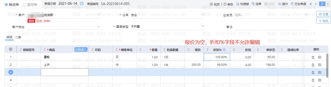 注意:单据折扣针对的是【报价】,所以如果单据上报价为空,那么【折扣%】是不允许编辑的: