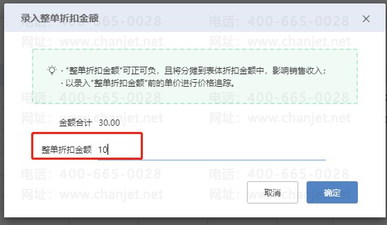 第二种折扣形式:整单优惠业务——不管一张单据上销售了多少金额的商品,都给与整单10元的优惠: